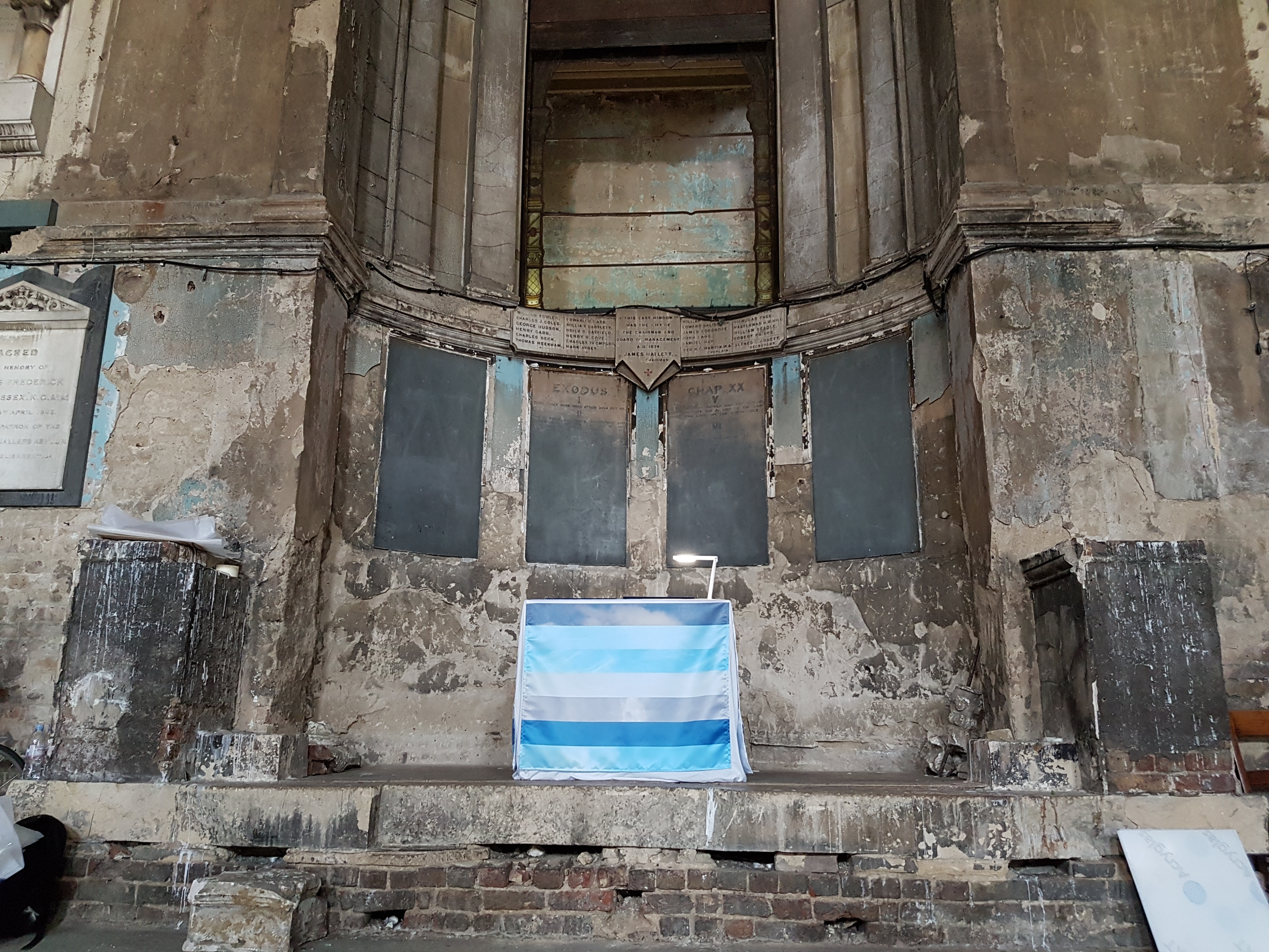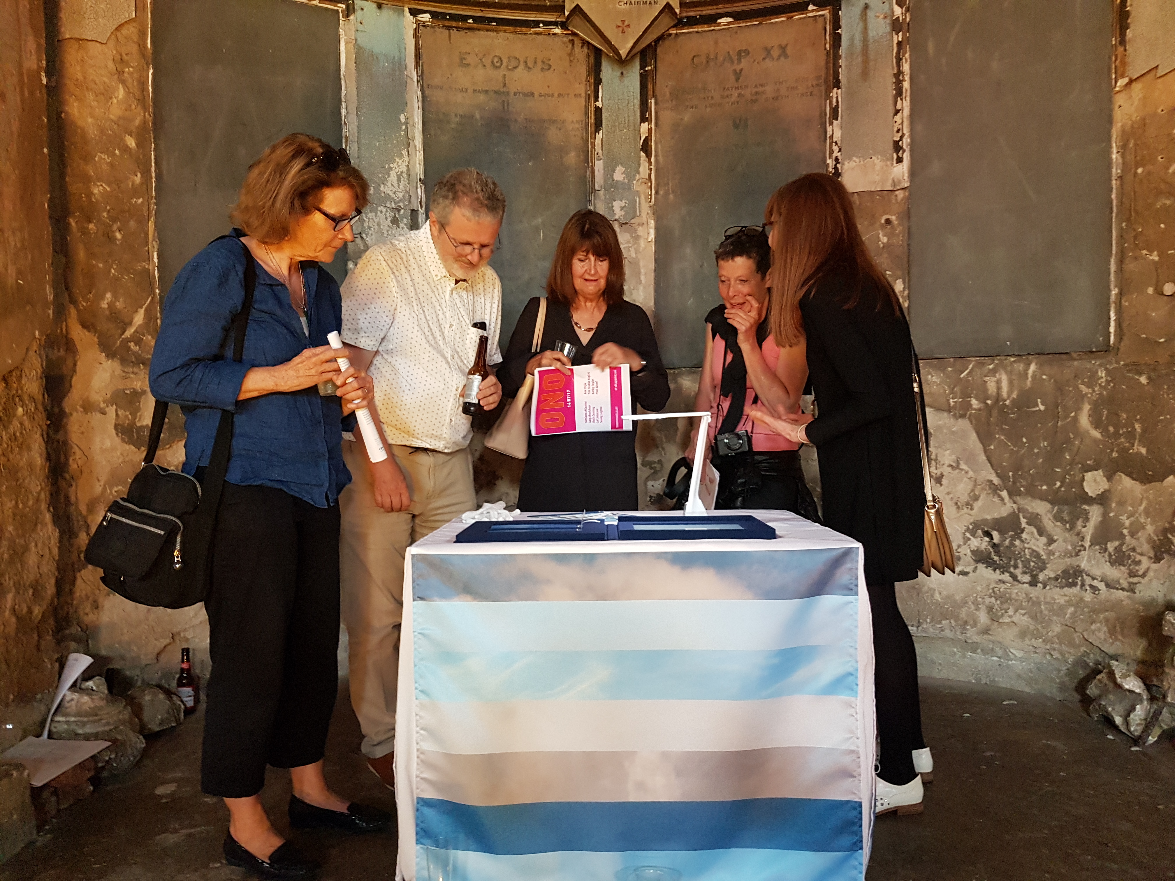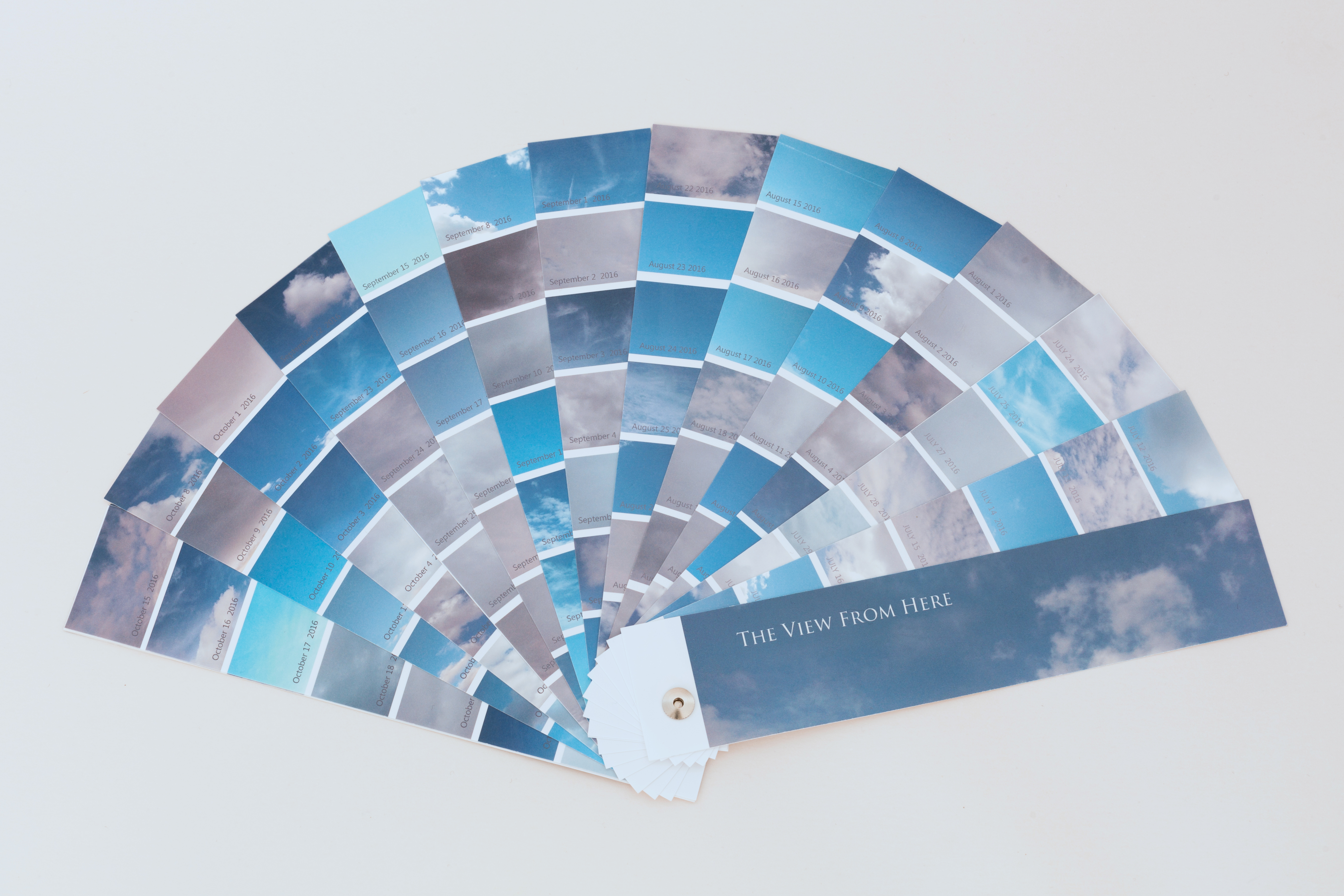 For over two years I photographed the view from my window each day. Just the sky and rooftops are visible from my vantage point. From skies over a season I created three fan-books like those used for paint samples. For this show, with 9 other artists, at a former church, the altar become the plinth on which the books were displayed. Visitors wore gloves to handle the books emphasizing the value or even sacredness of these everyday views.