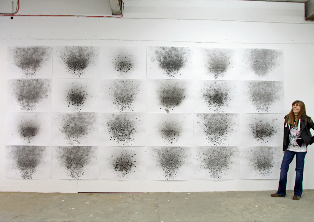 We take an average of 1000 breaths per hour, mostly unconsciously and invisibly. Using ink-stained bubbles I breathed 1000 times over each of 24 pages displayed, leaving a trace of the 24,000 breaths taken in a 24 hour period.